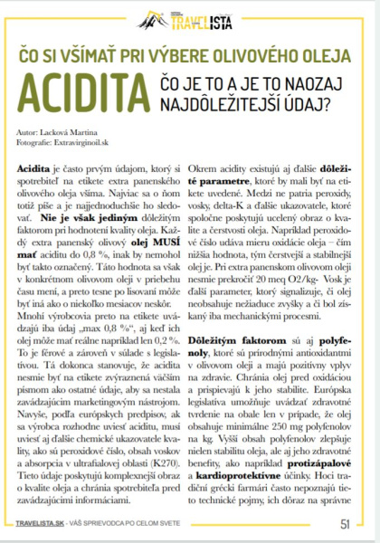 Acidita je často prvým údajom, ktorý si spotrebiteľ na etikete extra panenského olivového oleja všíma. Najviac sa o ňom totiž píše a je najjednoduchšie ho sledovať. Nie je však jediným dôležitým faktorom pri hodnotení kvality oleja. Každý extra panenský olivový olej MUSÍ mať aciditu do 0,8 %, inak by nemohol byť takto označený. Táto hodnota sa však v konkrétnom olivovom oleji v priebehu času mení, a preto tesne po lisovaní môže byť iná ako o niekoľko mesiacov neskôr.
