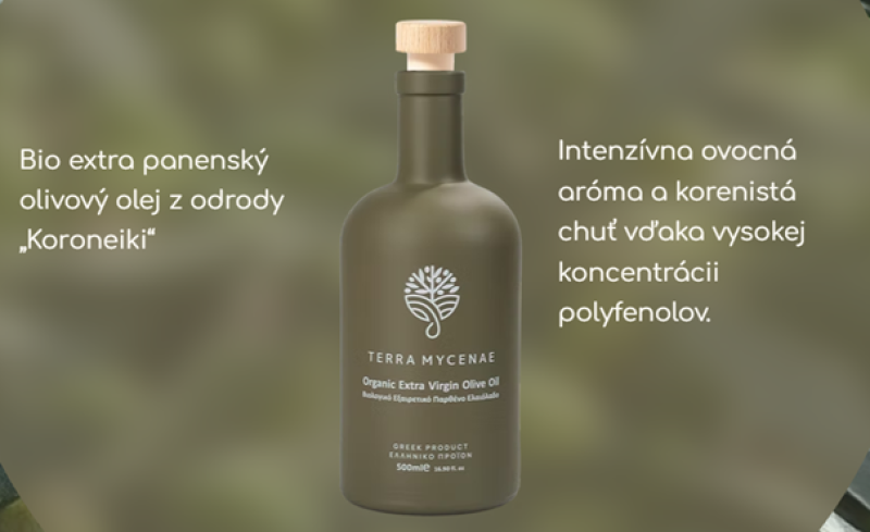 Terra Mycenae produkuje iba BIO extra panenský olivový olej z oblasti Mykén v Grécku, kde sa olivy pestujú už od čias starovekej civilizácie, ktorá formovala dejiny celého Stredomoria. Tento olej vzniká v rodinnej produkcii, ktorá nadväzuje na dlhoročnú tradíciu pestovania olív v regióne Prosymna v Argolide.